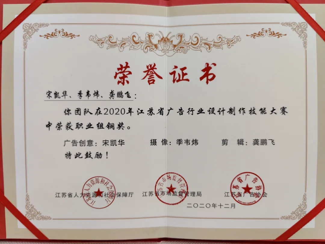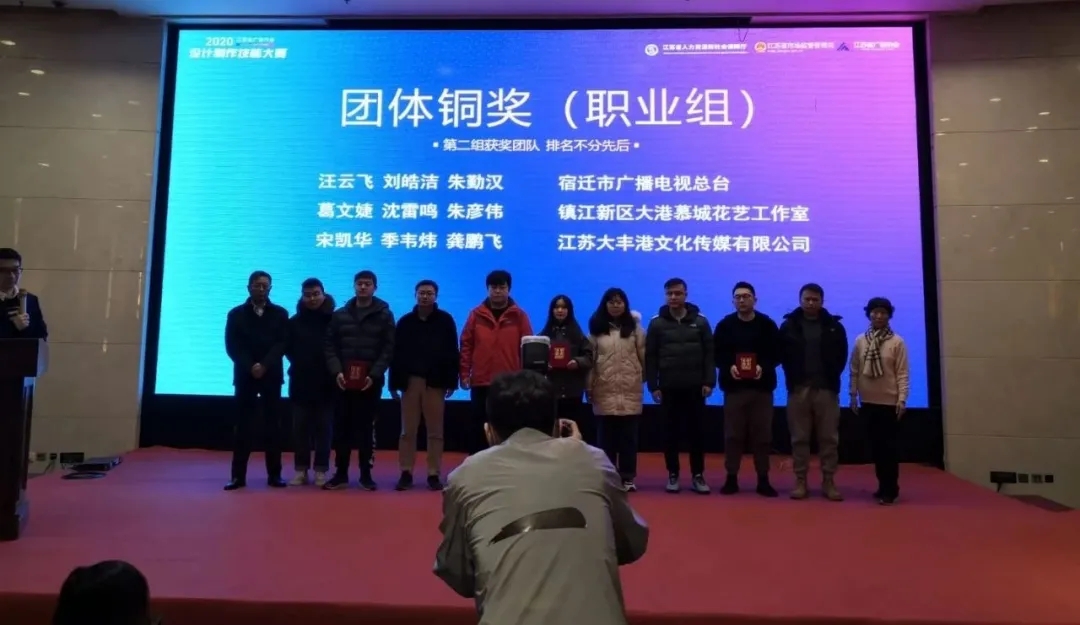 12月27日,由江蘇省人力資源和社會保障廳、市場監督管理局、廣告協會主辦的2020年江蘇省廣告行業設計制作技能大賽在南京圓滿收官。鹽城港集團旗下大豐港區傳媒公司團隊現場創作的《所見皆小康》短視頻作品榮獲職業組團體銅獎,成為鹽城地區獲得本次賽事最高獎項。