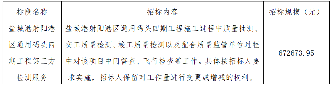 ⑴項(xiàng)目名稱(chēng):鹽城港射陽(yáng)港區(qū)通用碼頭四期工程第三方檢測(cè)服務(wù)