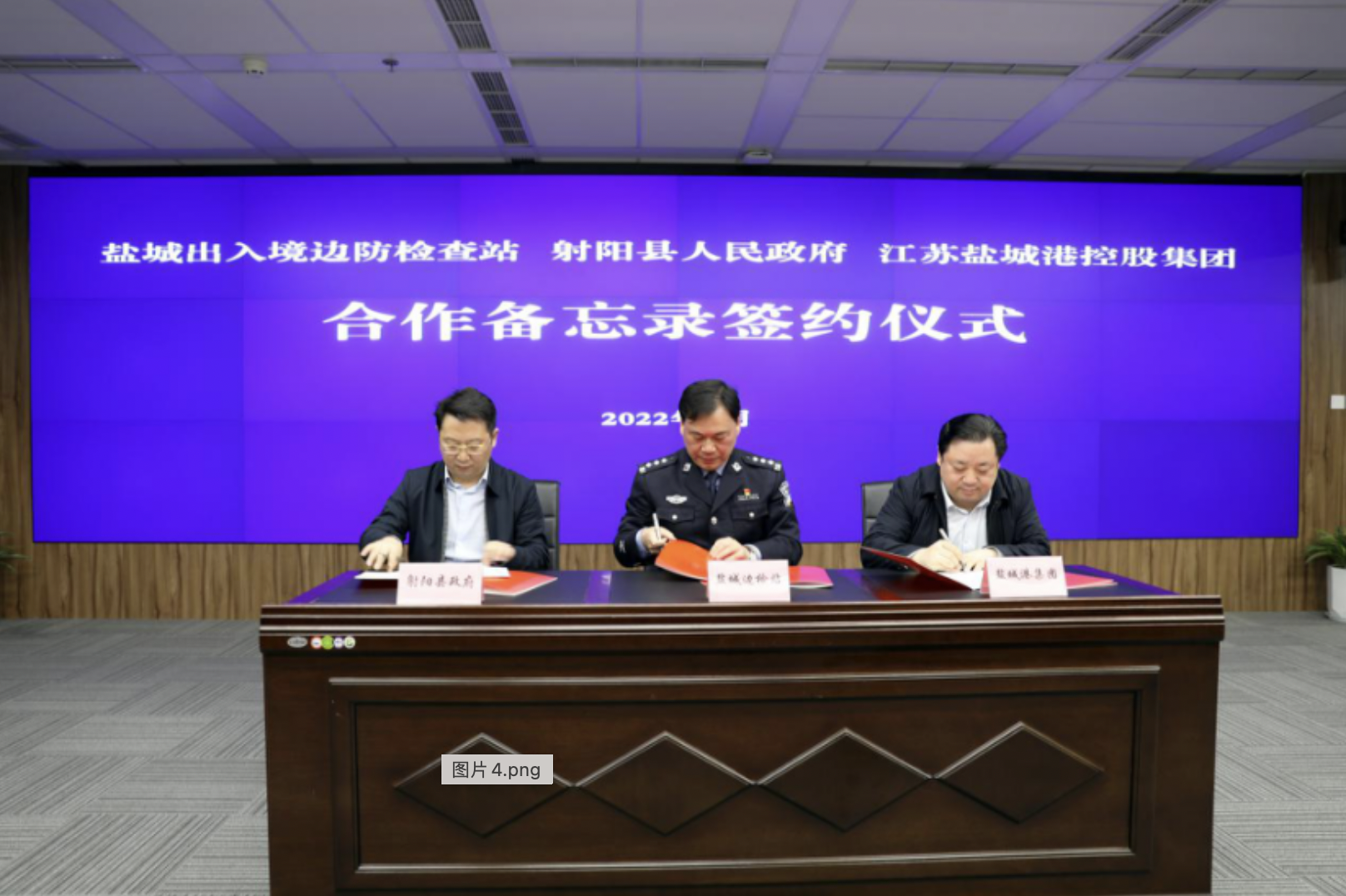 3月4日,鹽城出入境邊防檢查站、響水縣人民政府、射陽縣人民政府、鹽城港控股集團合作備忘錄簽約儀式在我集團舉行。市商務局局長、黨委書記、市口岸辦主任郭慶生,鹽城出入境邊防檢查站站長李興華,集團黨委書記、董事長、總經理周正雄,響水縣委副書記、縣長陸文忠,射陽縣委常委、常務副縣長凌曉東,響水縣副縣長田大波,射陽縣副縣長陳劍峰,鹽城出入境邊防檢查站政治委員王海燕,市口岸辦副主任、市商務局黨委委員陳國亮,市口岸辦副主任、市商務局黨委委員、二級調研員韓玉軍,集團黨委委員、紀委書記周旭東,總經理助理孫永峰等參加。