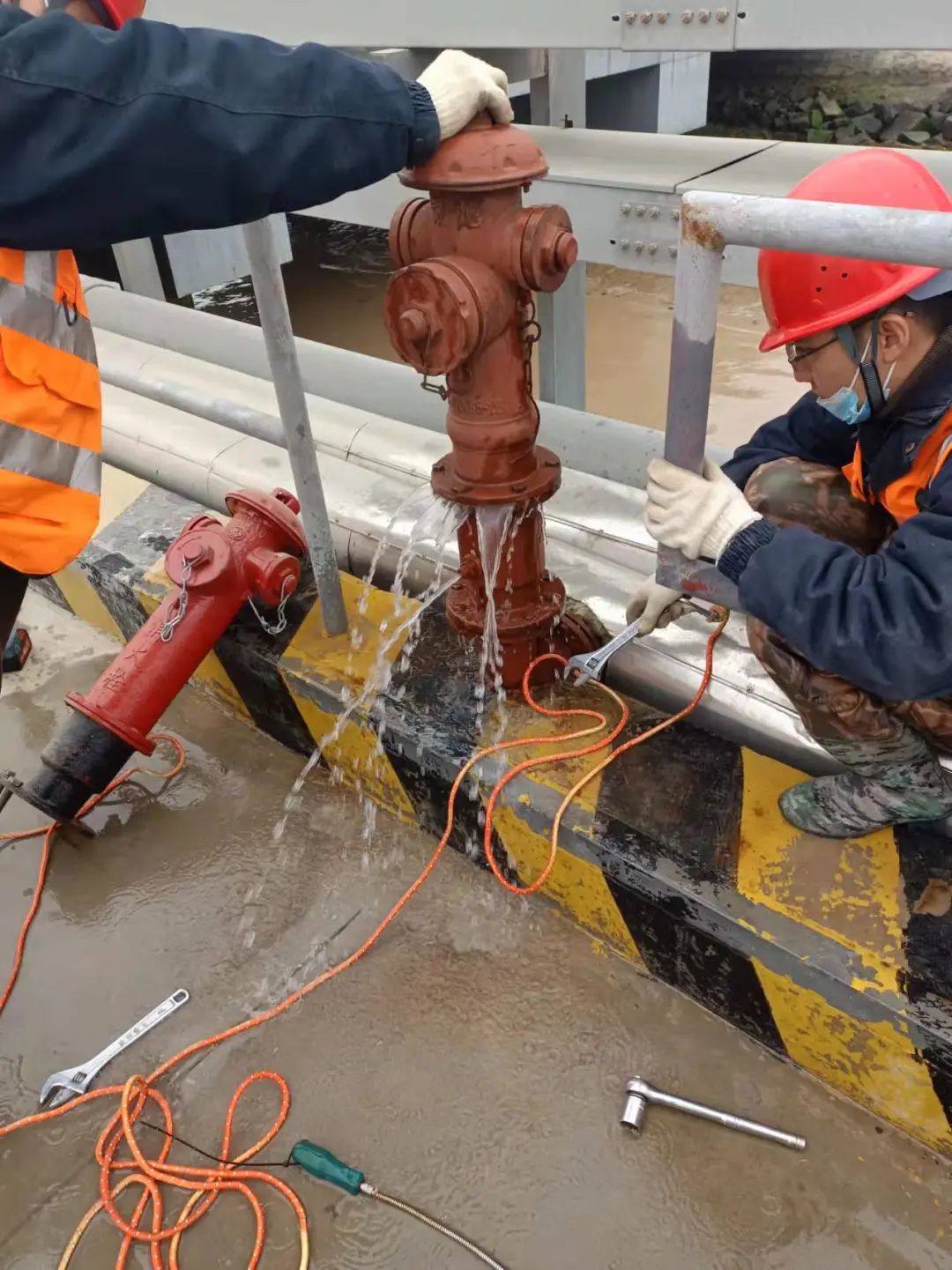 本次演練模擬惡劣天氣下港區(qū)碼頭消火栓爆裂,泄露出的水在碼頭路面結(jié)出冰面,并對(duì)往來(lái)車輛、人員造成了極大的安全隱患。港區(qū)巡查員發(fā)現(xiàn)隱患后,迅速向上級(jí)匯報(bào)并啟動(dòng)應(yīng)急預(yù)案,對(duì)破損消火栓進(jìn)行維修和更換,并加裝防寒保溫套,同時(shí)對(duì)碼頭面結(jié)冰區(qū)域拋灑融雪劑。經(jīng)過(guò)近半小時(shí)搶修,消防栓更換到位并停止漏水,碼頭面冰層消融,安全隱患排除。