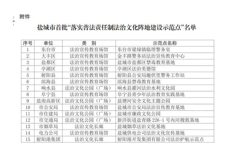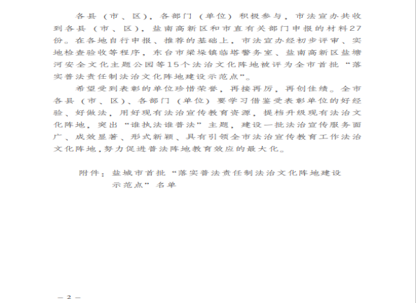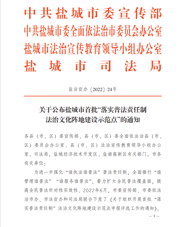 近期,由鹽城市委宣傳部、市委依法治市辦、市法宣辦、司法局4個部門單位發(fā)布關于公布鹽城市首批“落實普法責任制法治文化陣地建設示范點”的通知,江蘇鹽城港射陽港開發(fā)集團有限公司榮獲相關稱號。