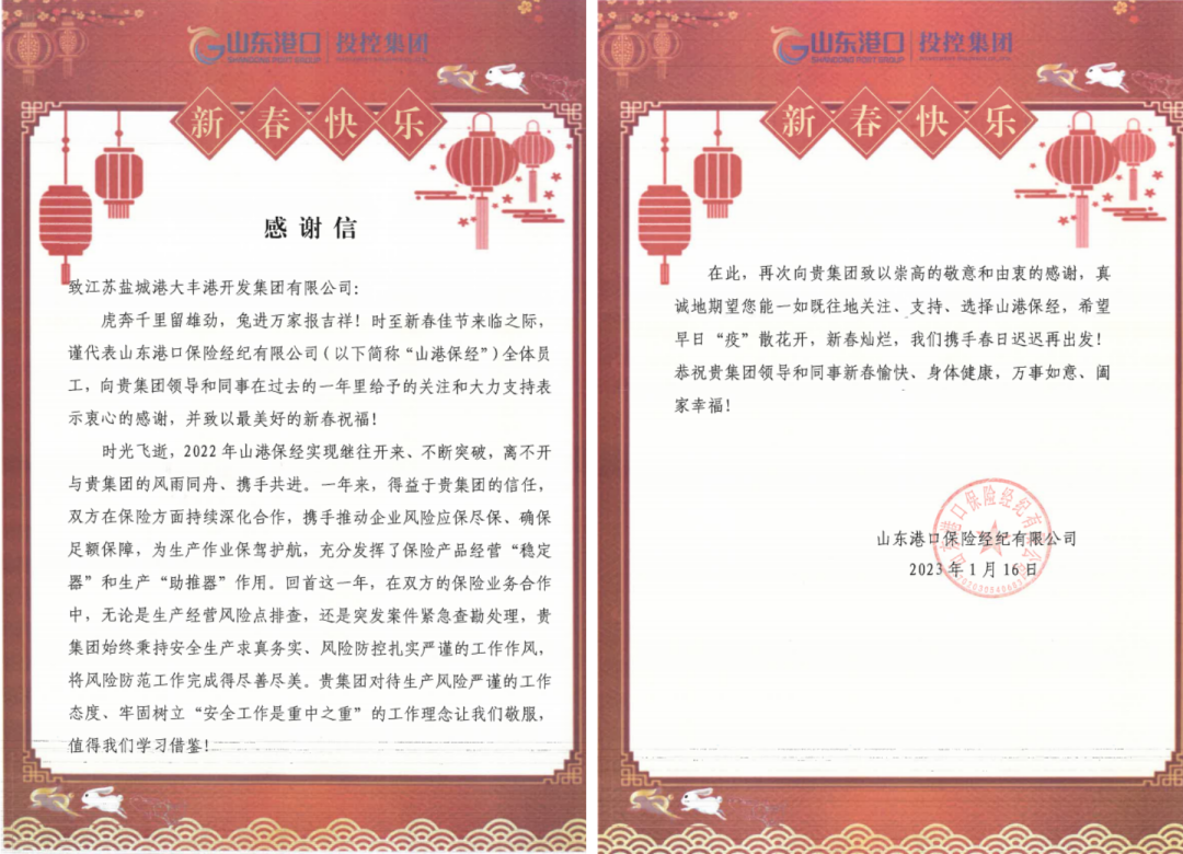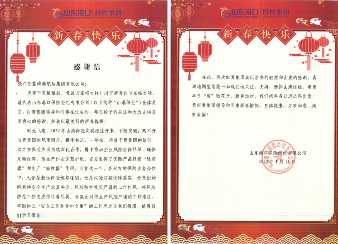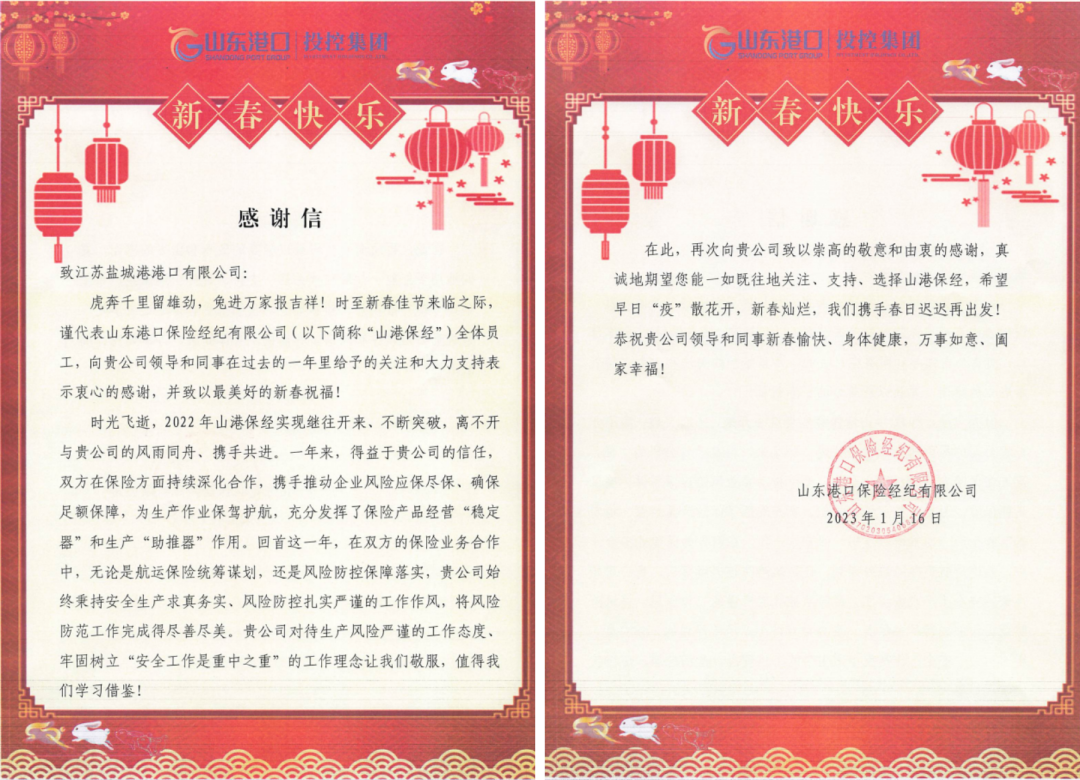 新歲序開,同赴新程。近日,集團(tuán)下屬江蘇鹽城港大豐港開發(fā)集團(tuán)、江蘇鹽城港港口公司、江蘇鹽城港航運(yùn)集團(tuán)三家單位分別收到來(lái)自山東港口保險(xiǎn)經(jīng)紀(jì)公司的感謝信。紙短情長(zhǎng),字字暖心。一封封感謝信,道出了鹽城港和山東港攜手發(fā)展的深厚情誼。