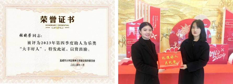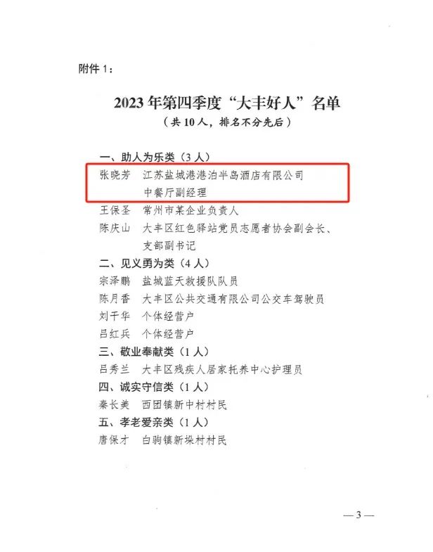 近日,鹽城市大豐區(qū)大力培育和踐行社會(huì)核心價(jià)值觀,積極開展2023年第四季度“大豐好人”推薦評選表彰活動(dòng),著力唱響“厚德大豐”品牌。經(jīng)推薦審核把關(guān)、組委會(huì)評議、社會(huì)公示監(jiān)督等程序,江蘇鹽城港港泊半島酒店有限公司張曉芳同志被授予“大豐好人”榮譽(yù)稱號(hào)。