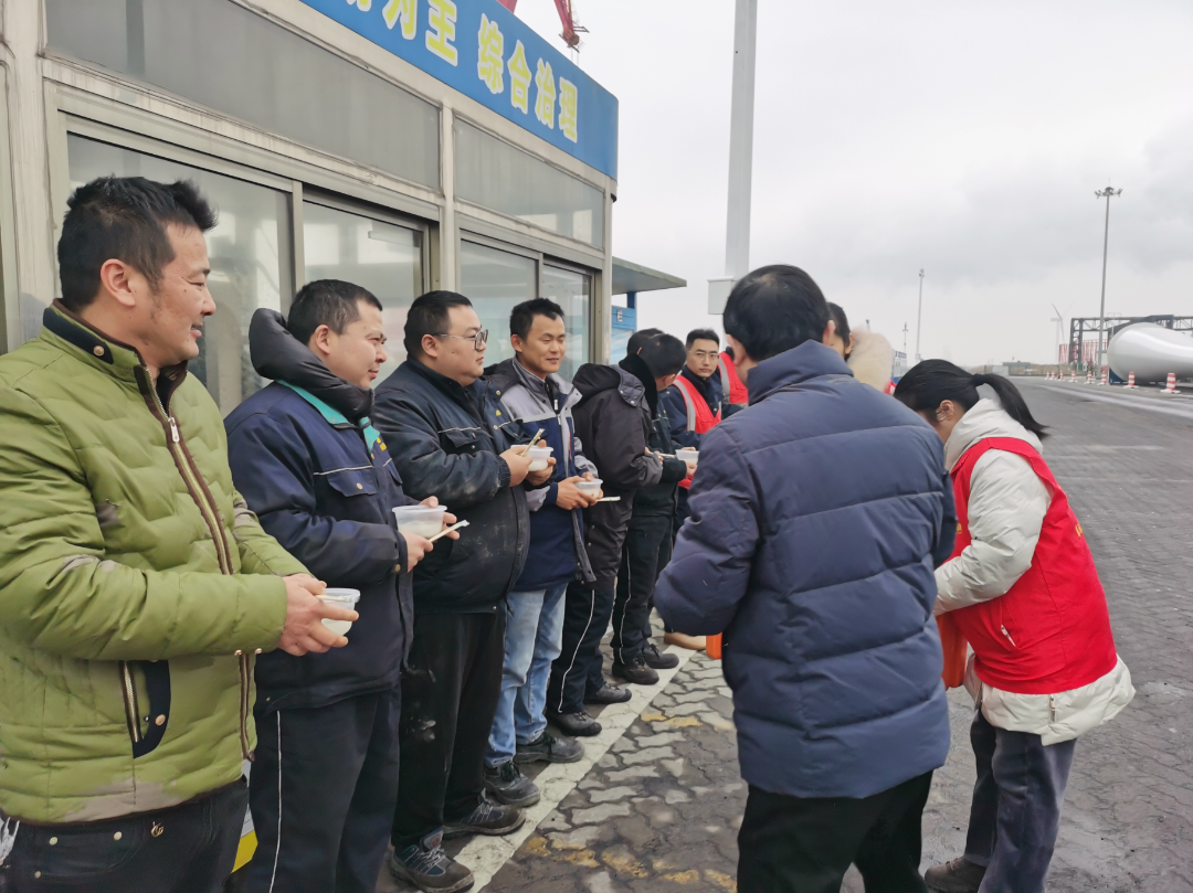 頂著凜冽寒風,射陽港區工會為大家送上熱氣騰騰的芝麻湯圓。每一顆香甜軟糯的湯圓都包含著衷心的祝福,醞釀著前行的暖意。