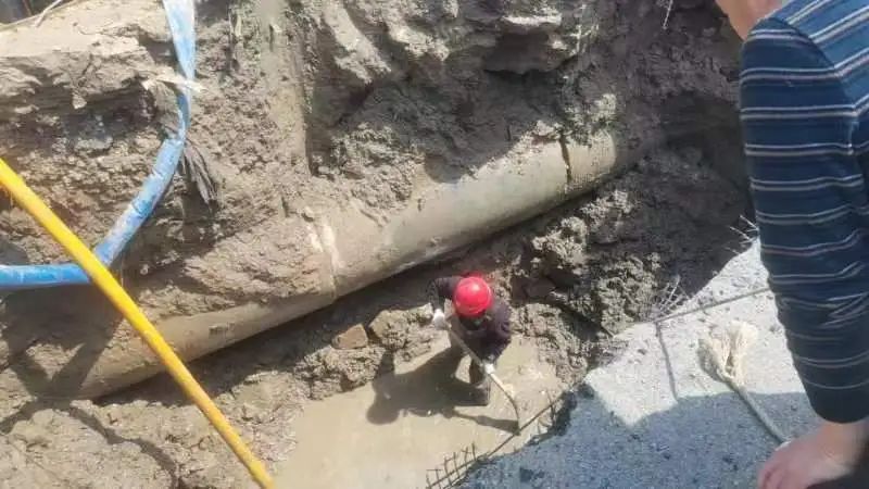 現場,搶修人員根據破損情況有序開展管道修復工作。臨近中午,維修人員仍在泥水中忙碌著……經過緊張搶修,順利恢復正常供水。