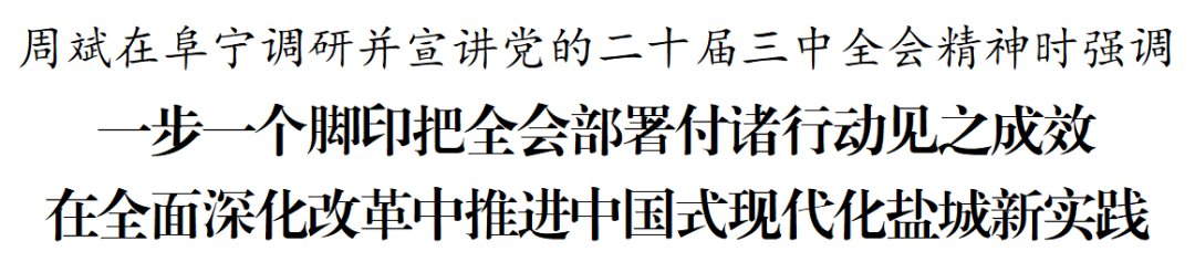 8月2日,市委書記周斌在阜寧縣調研并宣講黨的二十屆三中全會精神。他強調,要把學習貫徹黨的二十屆三中全會精神作為當前和今后一個時期的重大政治任務,用心學習領會,全面深化理解,廣泛宣傳宣講,一步一個腳印把全會改革部署付諸行動、見之成效,在全面深化改革中推進中國式現代化鹽城新實踐。